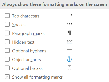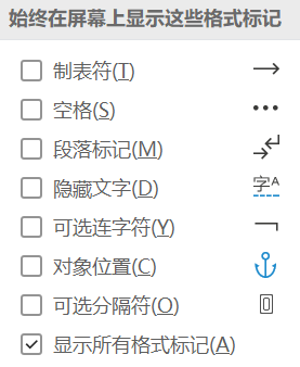 这里好像有个Bug,当创作语言和校对是英语,显示语言是中文时,虽然文档里显示的格式标记会变成英语那一套,但是文件→选项→显示里的符号是中文那一套的。