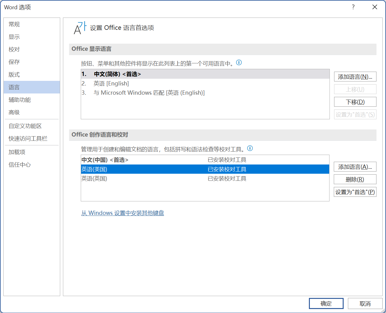 在Word的文件→选项→语言里,可以设置显示语言和创作语言和校对。