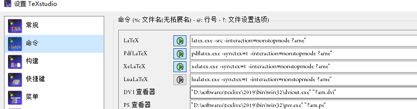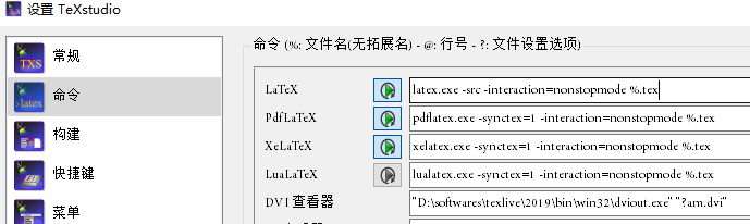 好了,原因找到了,下面就是怎么解决它。涉及到路径的问题,多半是编译的时候路径没有加双引号。看TeXStudio编译时的消息,应该是首先把路径更改到源文件所在目录,编译时文件名前没有路径。再去看设置-->命令面板,默认编译命令设置是下面这样的,可以看到其中 %.tex 指代源文件名。