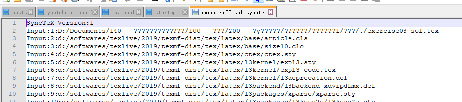 显然这一行指明了tex源文件的位置,乱码了自然不行。然后又查看VS Code编译产生的.synctex文件,果然没有乱码。
