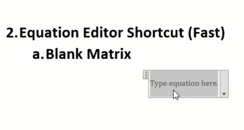 Animation of fastest way to insert matrix in Ms Word using equation editor shortcut.