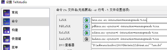 显然这一行指明了tex源文件的位置,乱码了自然不行。然后又查看 VS Code 编译产生的.synctex文件,果然没有乱码。好了,原因找到了,下面就是怎么解决它。涉及到路径的问题,多半是编译的时候路径没有加双引号。看 TeXStudio 编译时的消息,应该是首先把路径更改到源文件所在目录,编译时文件名前没有路径。再去看设置-->命令面板,默认编译命令设置是下面这样的,可以看到其中 %.tex 指代源文件名。